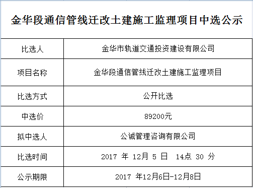 金華段通信管線遷改土建施工監(jiān)理項目中選公示
