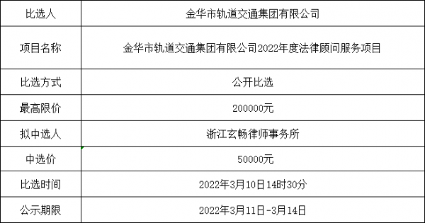 金華市軌道交通集團(tuán)有限公司2022年度法律顧問(wèn)服務(wù)項(xiàng)目中選公示