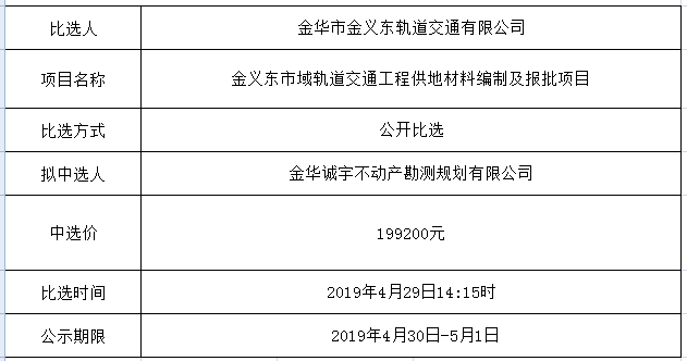 金華市金義東軌道交通有限公司運營2026-2027年度活動實施服務機構(gòu)框架協(xié)議項目中標候選人公示